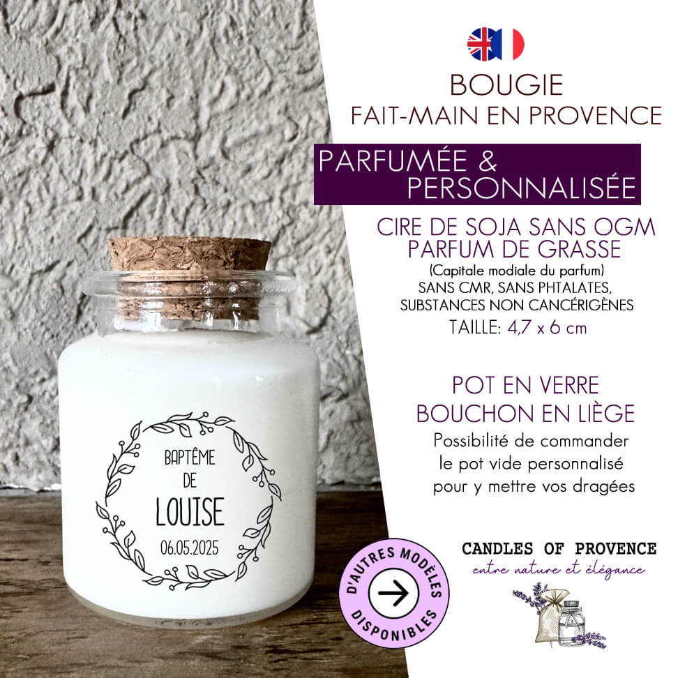 " /> Bougie baptême personnalisée feuillage – Cadeau invité élégant