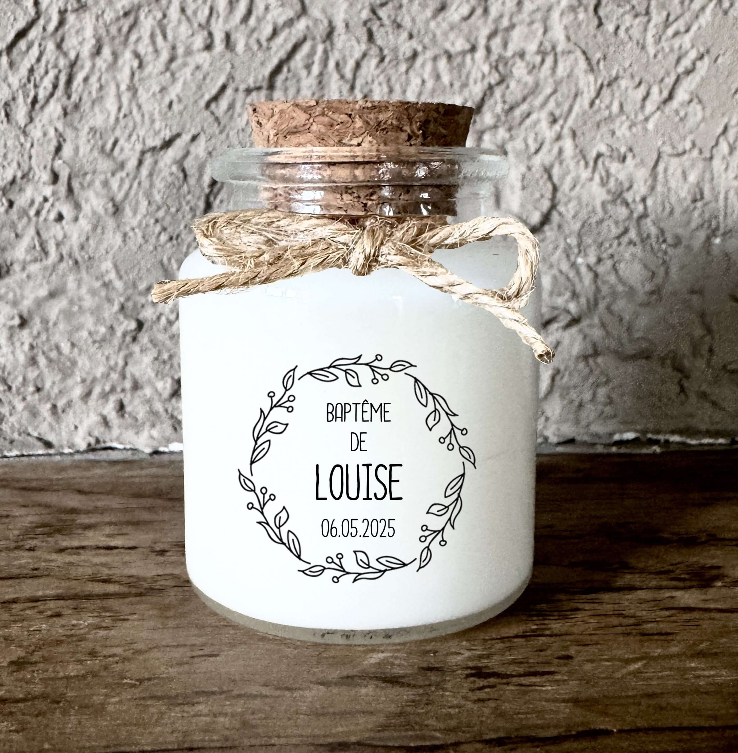 Bougie baptême personnalisée feuillage – Cadeau invité élégant