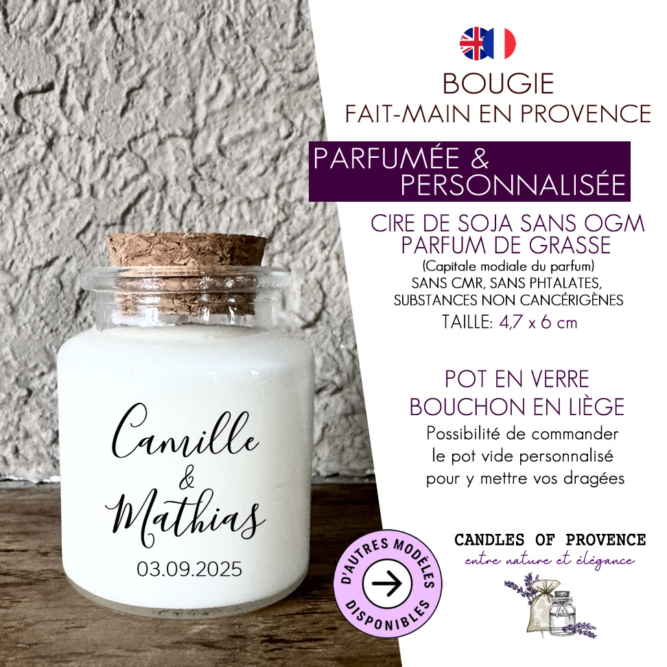 Apportez une touche authentique et chaleureuse à votre mariage avec nos bougies artisanales personnalisées. Chaque bougie est coulée à la main en France à partir de cire de soja naturelle et végan.