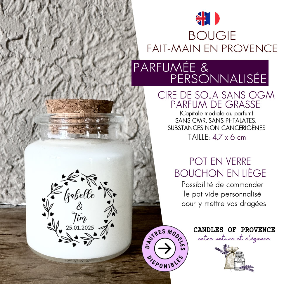 Offrez un souvenir romantique et naturel à vos invités. Chaque bougie est fabriquée à la main en France à partir de cire de soja naturelle et végan.
