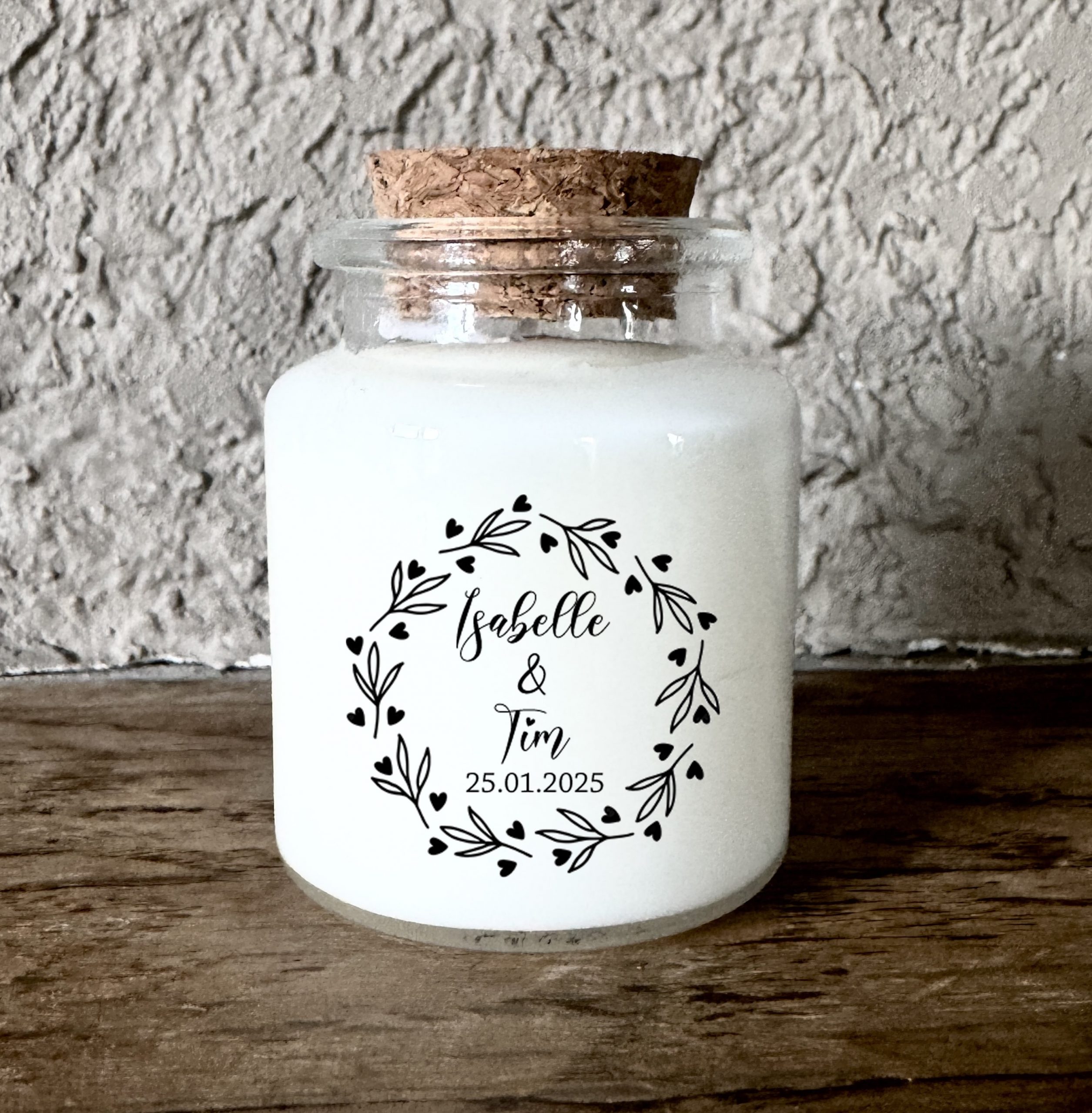 Présentée dans un pot en verre avec bouchon liège et corde de jute, cette bougie personnalisée est un cadeau plein de charme.