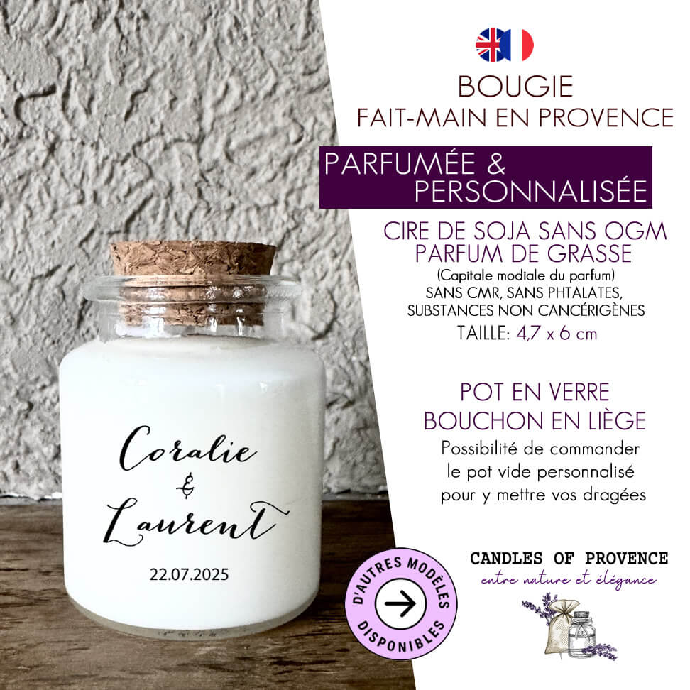 Présentée dans un pot en verre avec bouchon en liège, cette bougie personnalisée est un souvenir délicat et intemporel.