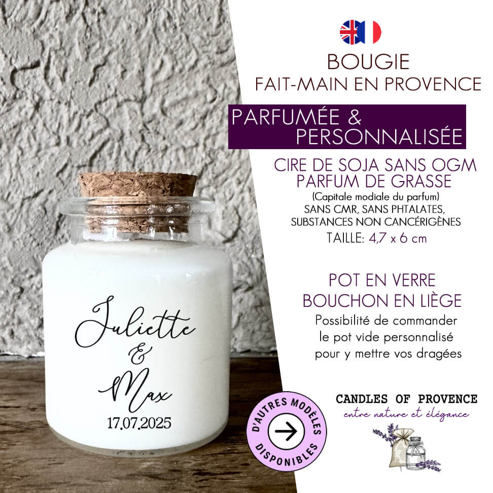 Offrez à vos invités un souvenir plein de charme et d’authenticité. Chaque bougie est fabriquée à la main en France, en cire de soja naturelle et végan.