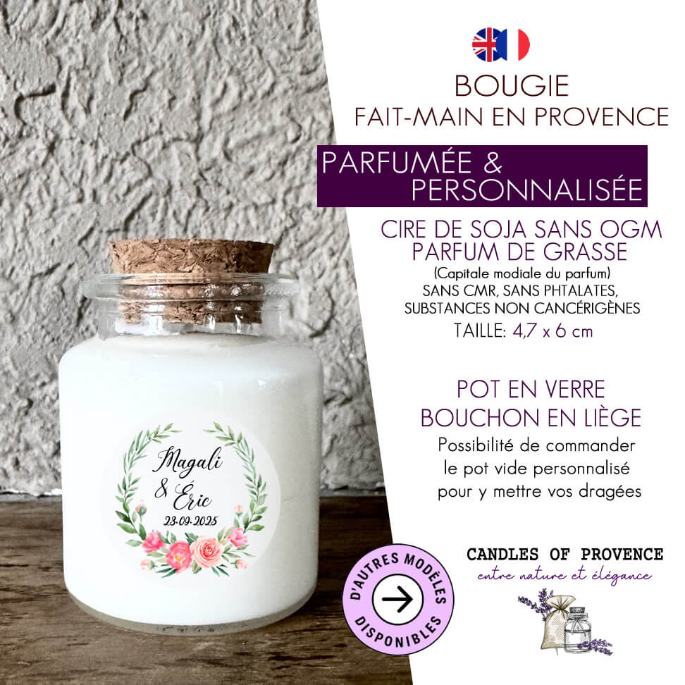Cette bougie parfumée fait-main est parfaite pour vos invités de mariages, baptêmes, communions, anniversaires, babyshowers, naissance, fêtes, repas, cadeaux, évènements… Vos invités l’adoreront !
