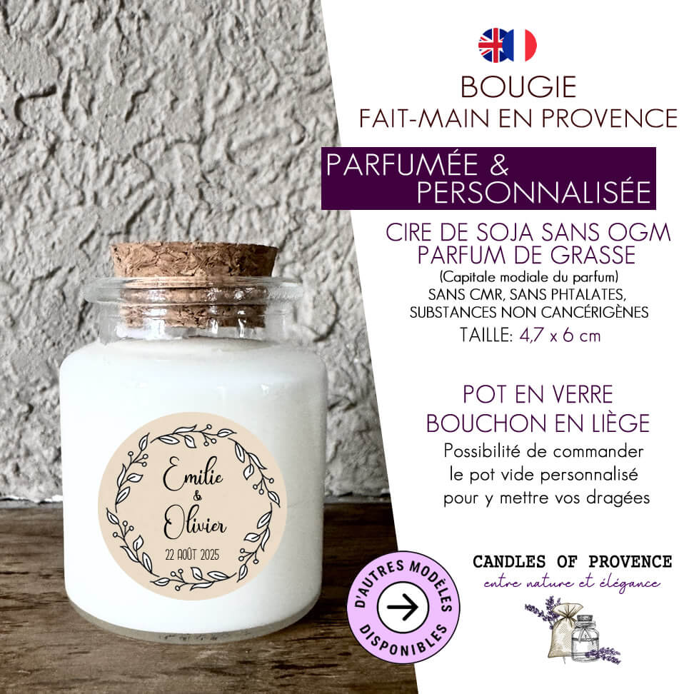 Cette bougie parfumée fait-main est parfaite pour vos invités de mariages, baptêmes, communions, anniversaires, babyshowers, naissance, fêtes, repas, cadeaux, évènements… Vos invités l’adoreront !