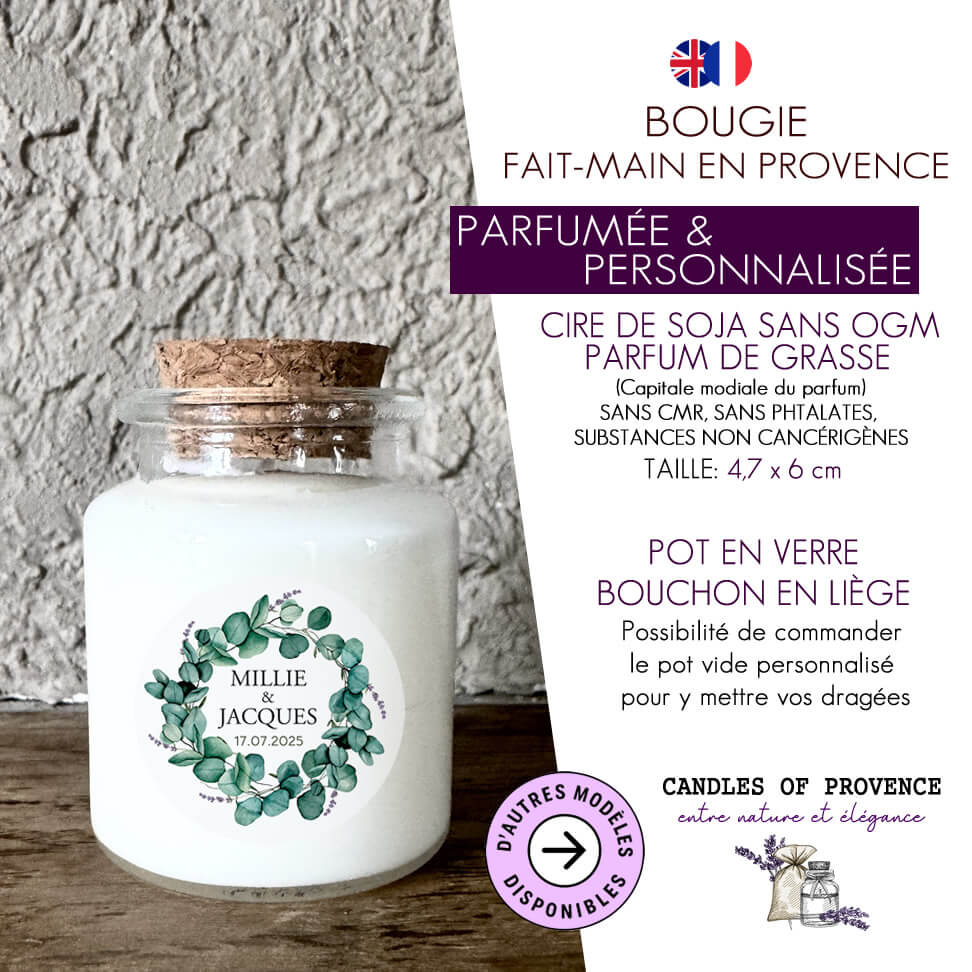 Bougie parfumée personnalisée mariage – Modèle Eucalyptus et Lavande.