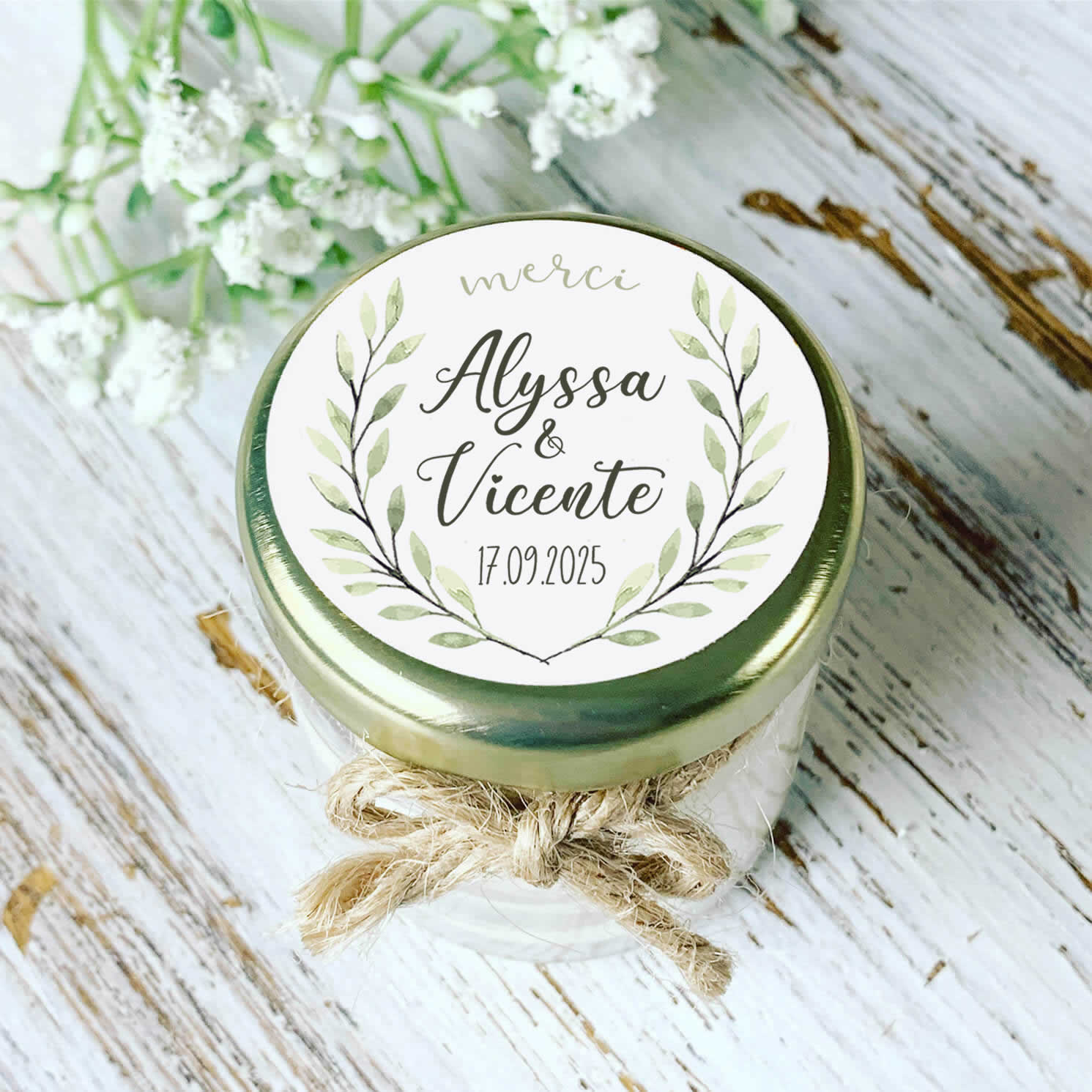Cette mini bougie parfumée personnalisée est idéale pour offrir un souvenir élégant et accessible à vos invités de mariage. Le design eucalyptus, doux et romantique, convient parfaitement aux couples qui souhaitent un cadeau personnalisé à petit budget tout en gardant un rendu esthétique et mémorable.