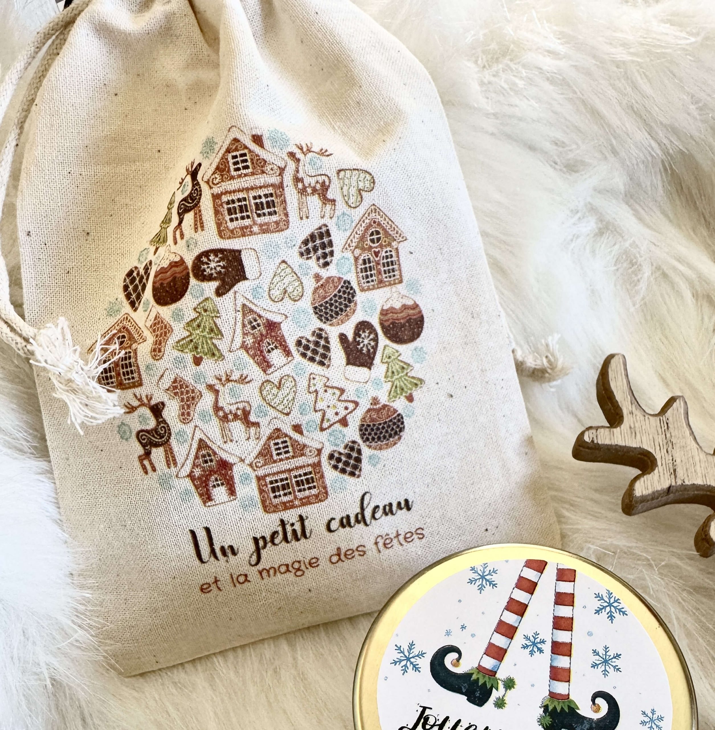 Le pochon décoré de petits biscuits, sapins et maisons en pain d’épices apporte une touche festive pleine de douceur. La bougie diffuse une ambiance cosy qui rappelle la magie des fêtes. Ce coffret personnalisé devient ainsi un cadeau attentionné et facile à offrir.