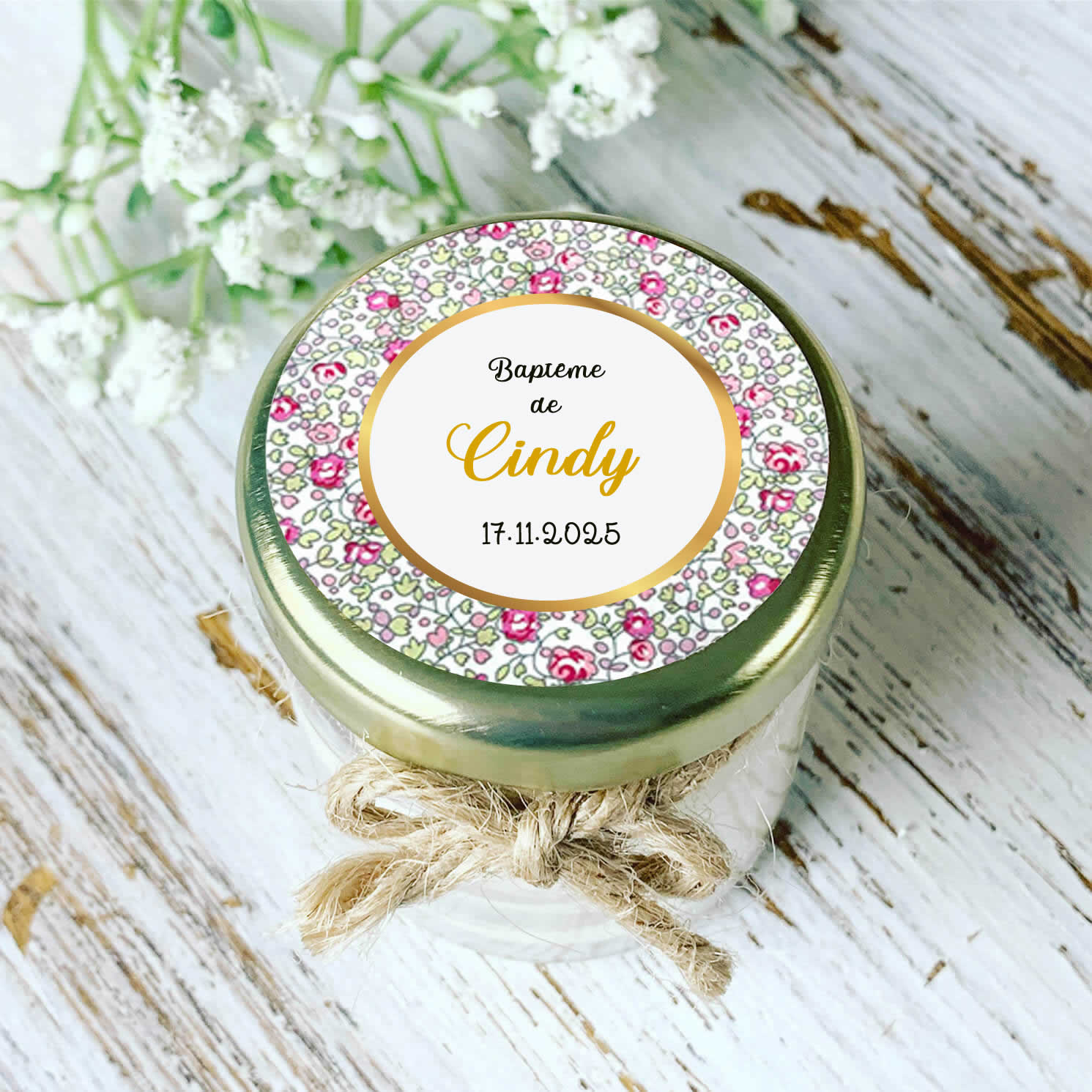 Cette bougie de baptême personnalisée au motif Liberty pastel est une attention délicate et pleine de charme pour vos invités. Ses tons doux et fleuris apportent une ambiance poétique à votre décoration de table. Avec le prénom et la date du baptême, elle devient un souvenir unique que vos proches garderont avec plaisir.