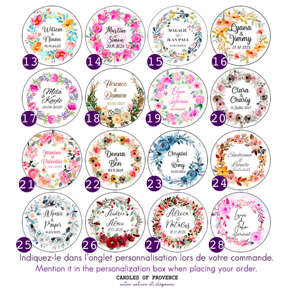 Chaque bougie est coulée à la main avec une cire végétale naturelle. Elle offre un souvenir parfumé que vos invités garderont longtemps. Ce modèle floral et feuillage convient parfaitement à un mariage printanier, bohème ou champêtre.