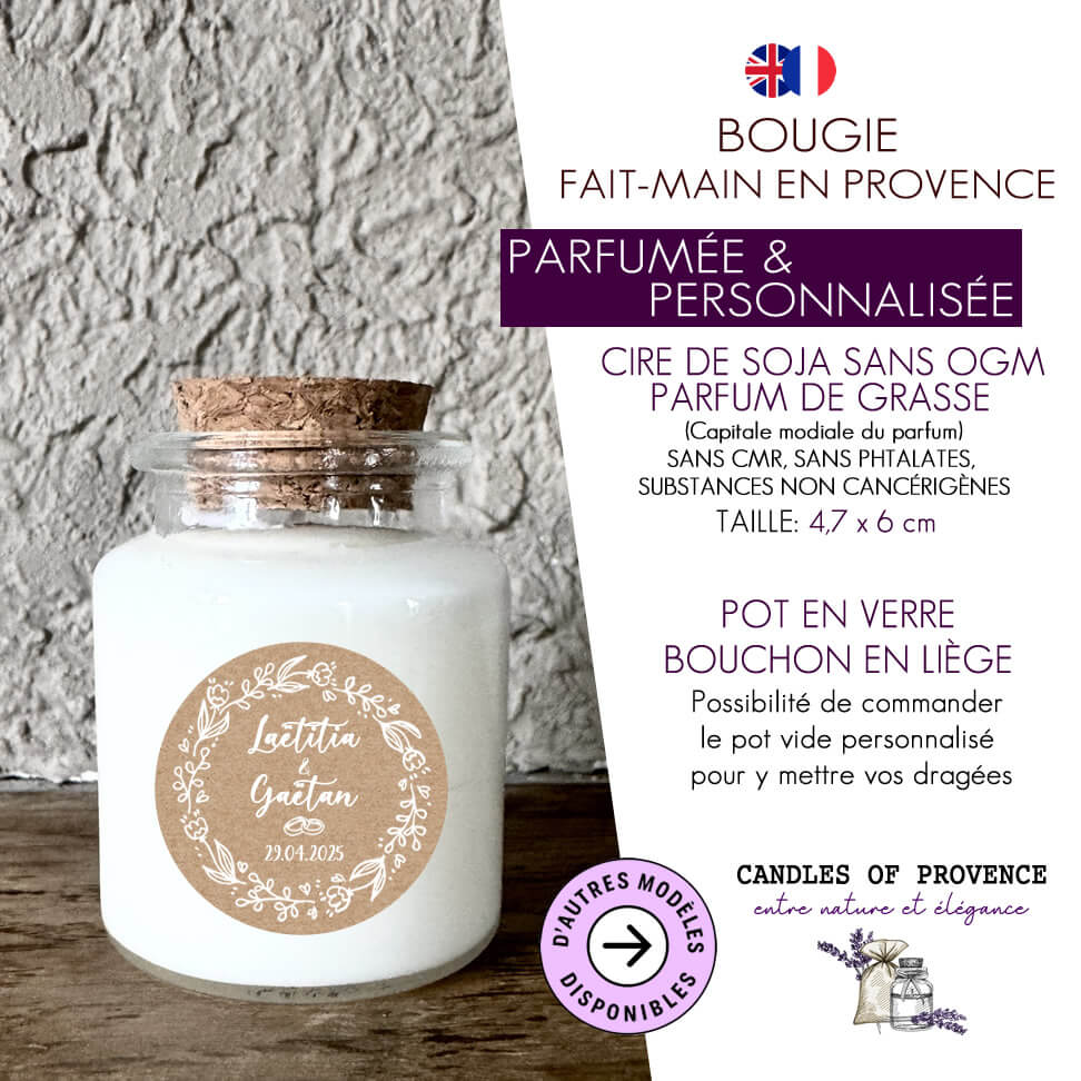 Cette bougie parfumée fait-main est parfaite pour vos invités de mariages, baptêmes, communions, anniversaires, babyshowers, naissance, fêtes, repas, cadeaux, évènements… Vos invités l’adoreront !