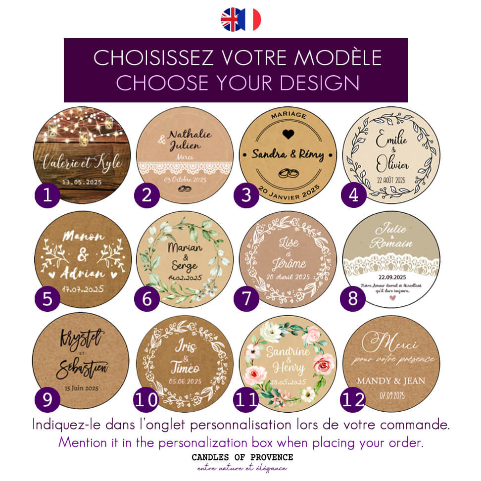 Chaque bougie est fabriquée à la main avec une cire végétale. Ainsi, elle devient un cadeau invité élégant et chaleureux. De plus, son style raffiné convient à tous les thèmes de mariage. Elle crée aussi un souvenir attentionné que vos convives apprécieront.