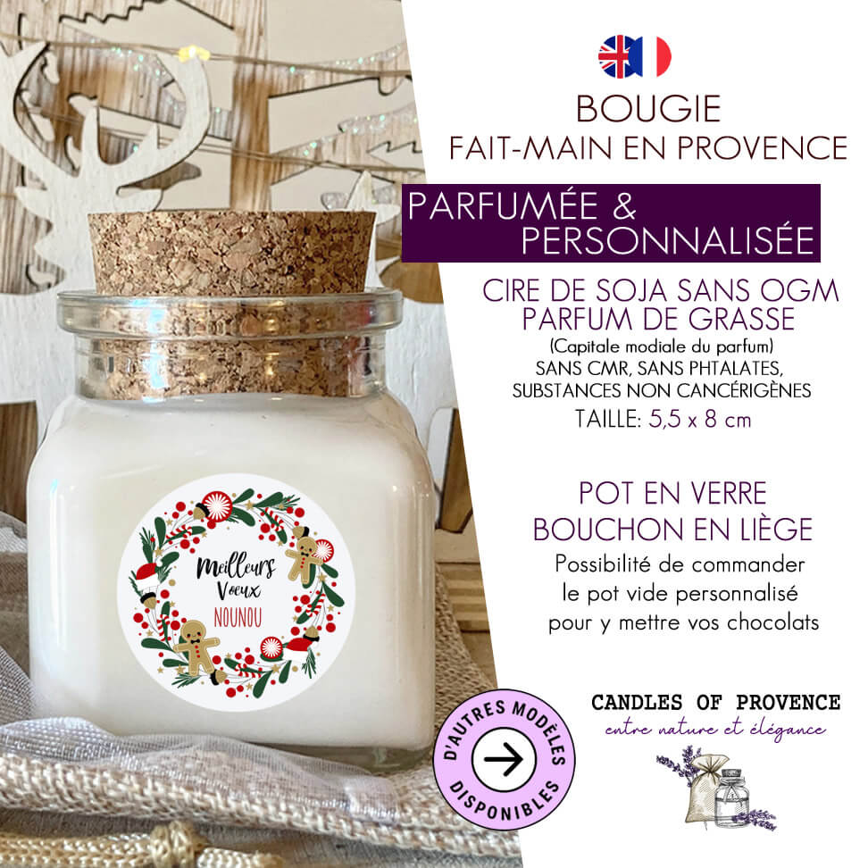Vous pouvez ajouter un joli pochon ou une clé décapsuleur en option pour offrir une présentation encore plus soignée. Cette bougie personnalisée sera parfaite sous le sapin ou posée en décoration pour célébrer la fin d’année.