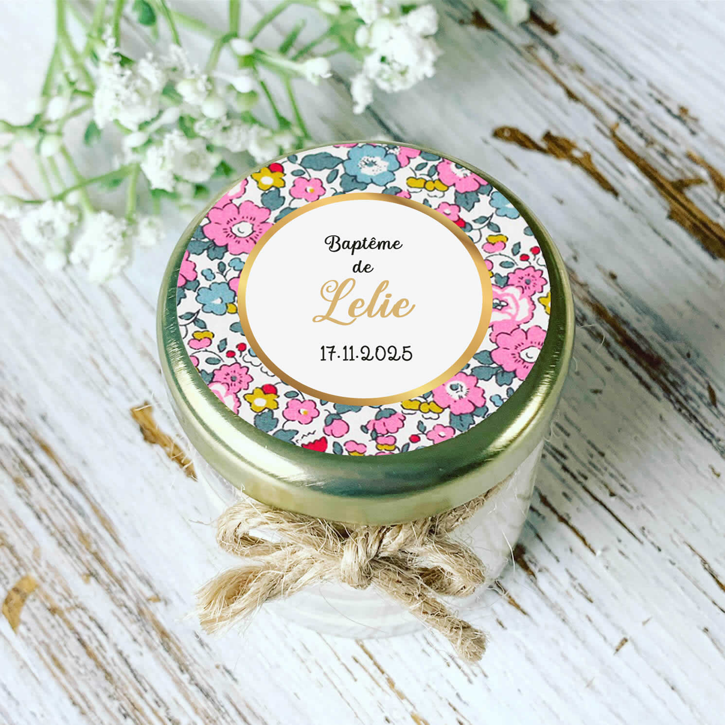 Cette jolie bougie personnalisée au motif Liberty rose apporte une touche douce et colorée à votre événement. Son motif fleuri, à la fois lumineux et délicat, met en valeur le prénom et la date du baptême. Vos invités apprécieront ce souvenir unique, facile à garder et agréable à offrir.